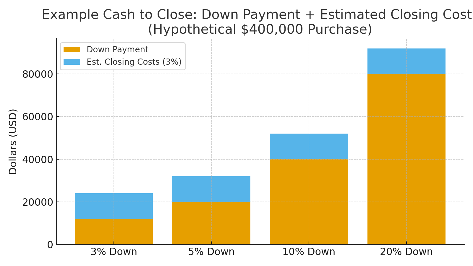 After that, compare scenarios side by side. With that in mind, look at 3%, 5%, 10%, and 20% options and note the differences in monthly payment, PMI, and cash to close. (See the illustrative chart above for how cash needs scale.) Ultimately, the “right” down payment balances comfort, approval, and timeline—so you can shop with confidence.